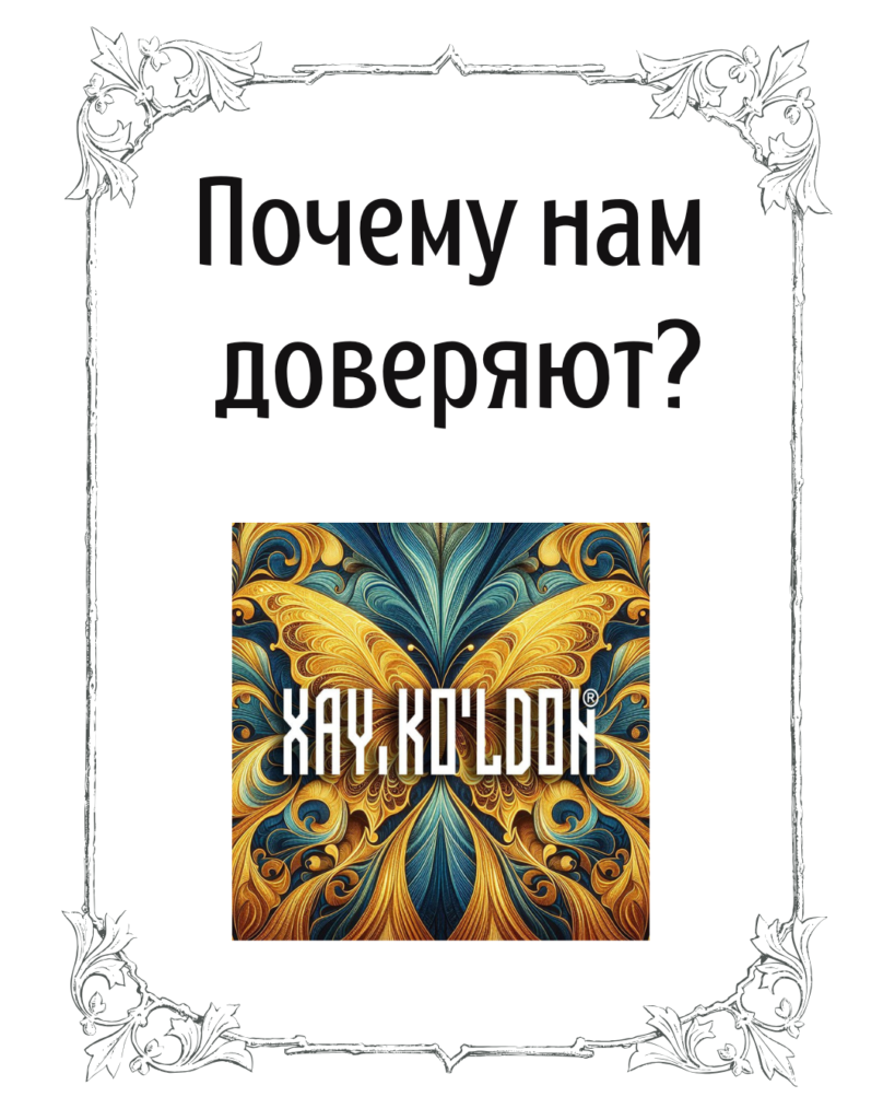 04 Фев Блог Почему нам стоит доверять? 29.04.2025 By Administrator 0 comments Семейное предприятие Xay-ko'ldon – здоровье, проверенное временем! Почему нам стоит доверять? В современном мире, где р... Continue reading